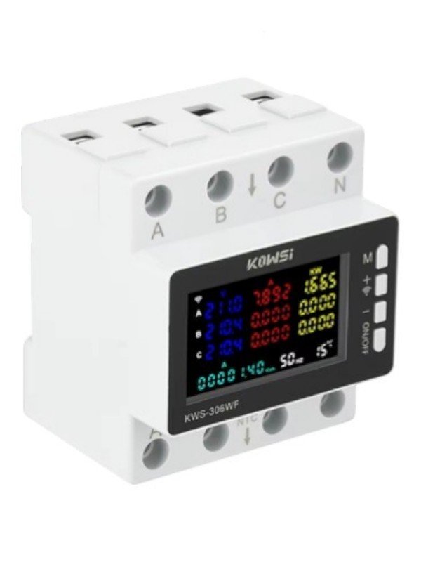 Contor energie trifazat WiFi KWS-306WF cu afisaj LCD, montaj pe sina DIN 35 mm. Masoara tensiune, curent, putere si consum energie in sisteme trifazate.